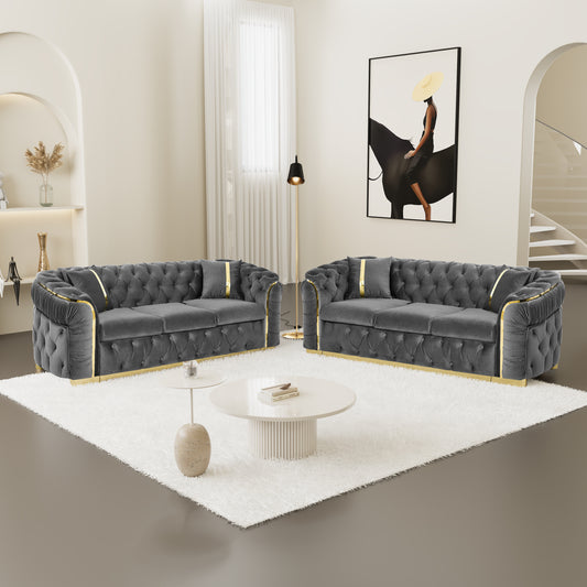 2PCS 90.6 Inches Velvet Button Tufted Sofa Couch with 2 Pillows, 3 Seater Luxury Chesterfield Sofa Set with Gold Stainless Steel Accents for Living Room, 280g Italian Velvet Gray