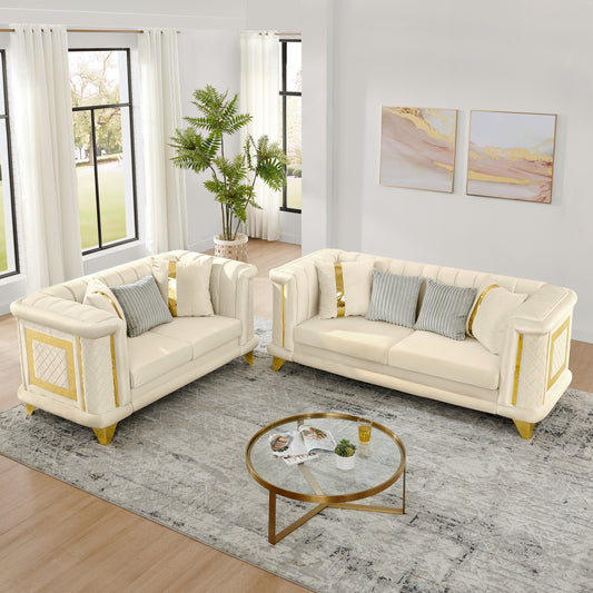 2PCS Velvet Luxury Sofa Set with Gold Stainless Steel Trims and Embroidered Texture, Mid Century Modern Victorian 89 Inches 3 Seater & 69 Inches Loveseat Tufted Couch for Living Room, Beige
