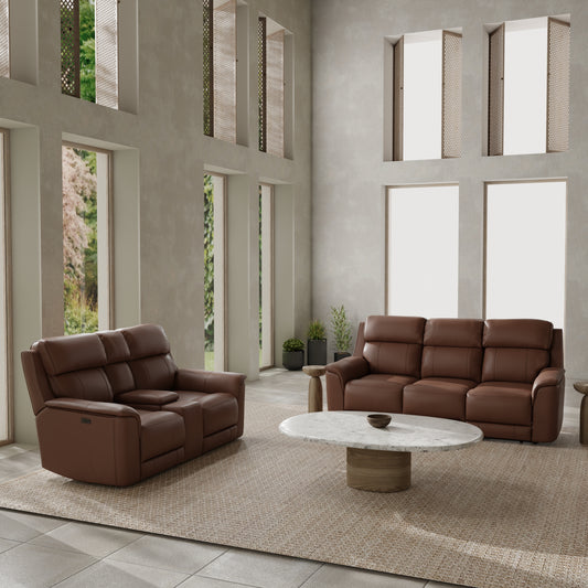 Oslo Dual Power Reclining Sofa and Love Seat with a Manual Swivel Glider Recliner in Pecan